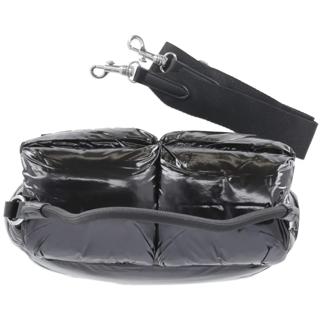 Die Flap Bag VARSITY ZORA in Schwarz setzt mit puff-gestepptem Lackdesign und markantem Frontlogo ein klares Statement. Die kompakte Silhouette (ca. 15 x 25 x 10 cm) fasst rund 3 Liter und bietet mit einem Reißverschlussfach sowie einem Steckfach strukturierte Übersicht für Essentials. Der magnetische Überschlag schließt sicher und lässt zugleich schnellen Zugriff zu. Flexible Tragemöglichkeiten ergeben sich aus dem festen Schulterriemen von ca. 40 cm und dem zusätzlich verstellbaren Gurt bis ca. 130 cm, so wird aus der eleganten Schultertasche im Handumdrehen eine komfortable Crossbody-Begleitung. Glänzende Oberfläche, weiches Volumen und klare Linien verbinden Mode und Funktion in einem vielseitigen Accessoire für Damen. Modetipp: Im monochromen Look mit schwarzem Blazer, Wide-Leg-Hose und metallischen Akzenten wirkt die Tasche besonders modern.