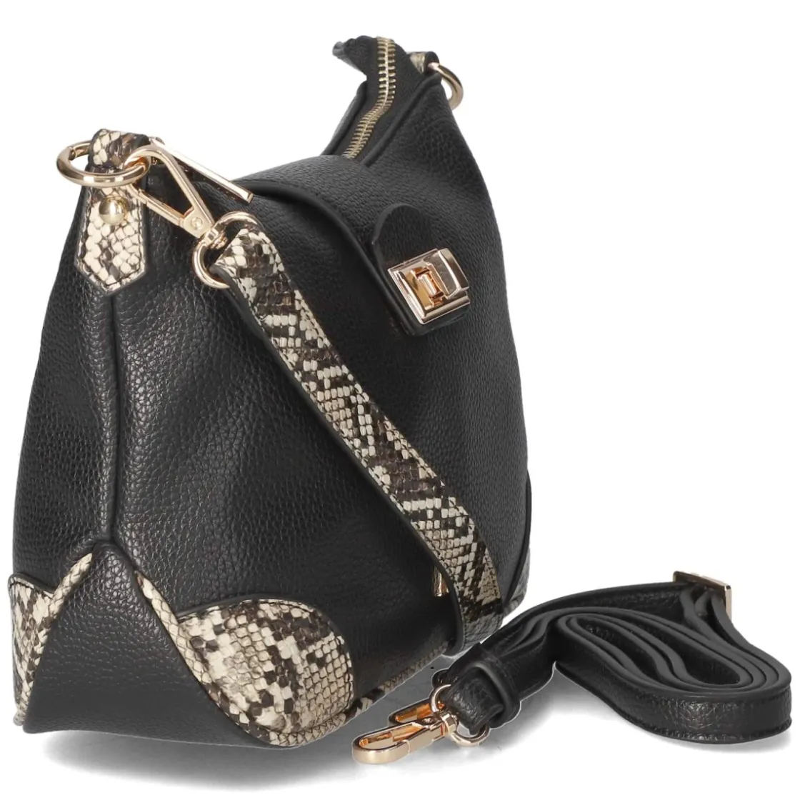 Diese schwarze Handtasche vereint klassische Linie mit modernem Akzent. Das kompakte Format von ca. 17 x 23 x 7 cm bietet bei rund 2,5 Litern Volumen erstaunlich viel Übersicht. Ein Reißverschlusshauptfach bewahrt Essentials sicher, innen strukturieren zwei Steckfächer und ein Reißverschlussfach den Alltag. Außen verleiht ein Überschlag mit elegantem Drehverschluss zusätzliche Sicherheit und eine edle Optik. Goldfarbene Akzente und Markenschriftzug setzen glanzvolle Highlights, während Partien im Reptilprint für subtilen Kontrast sorgen. Zwei abnehmbare Schulterriemen ermöglichen Wandelbarkeit: ein kürzerer von ca. 40 cm für die Schulter, ein längenverstellbarer bis ca. 110 cm für Crossbody-Komfort. Modetipp: Zu monochromen City-Looks mit Blazer und Slingbacks getragen, wirkt der Mix aus Schwarz und Reptilstruktur besonders raffiniert und verleiht minimalistischen Outfits Tiefe.