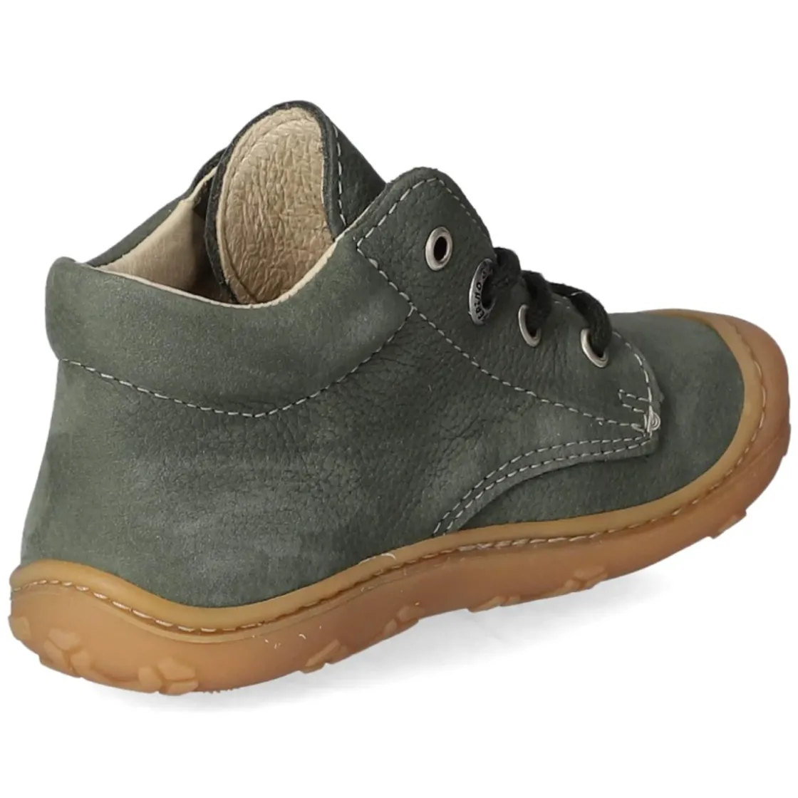 Der Halbschuh CORY von Pepino begleitet Kleinkinder sicher durch den Alltag. Weiches Rauleder und atmungsaktives Echtleder im Inneren sorgen für ein angenehmes Fußklima, während der bequem gepolsterte Einstieg Druckstellen vermeidet. Die runde Schuhspitze mit verstärkter Zehenpartie bietet Platz zum natürlichen Abrollen und schützt bei Krabbel- und Kletterabenteuern. Dank Schnürung lässt sich der Sitz exakt an kleine Füße anpassen. Die flexible, rutschhemmende Laufsohle unterstützt die ersten Schritte auf verschiedensten Untergründen. Praktisch im Alltag: die gepolsterte, herausnehmbare Leder-Decksohle als Wechselfußbett für einfache Pflege und Passformkontrolle. Der normal ausfallende Schnitt erleichtert die Größenwahl. Das frische Grün setzt fröhliche Akzente. Modetipp: harmoniert besonders schön mit cremefarbenen Stricksocken, Latzhose aus Denim und einem gestreiften Longsleeve.