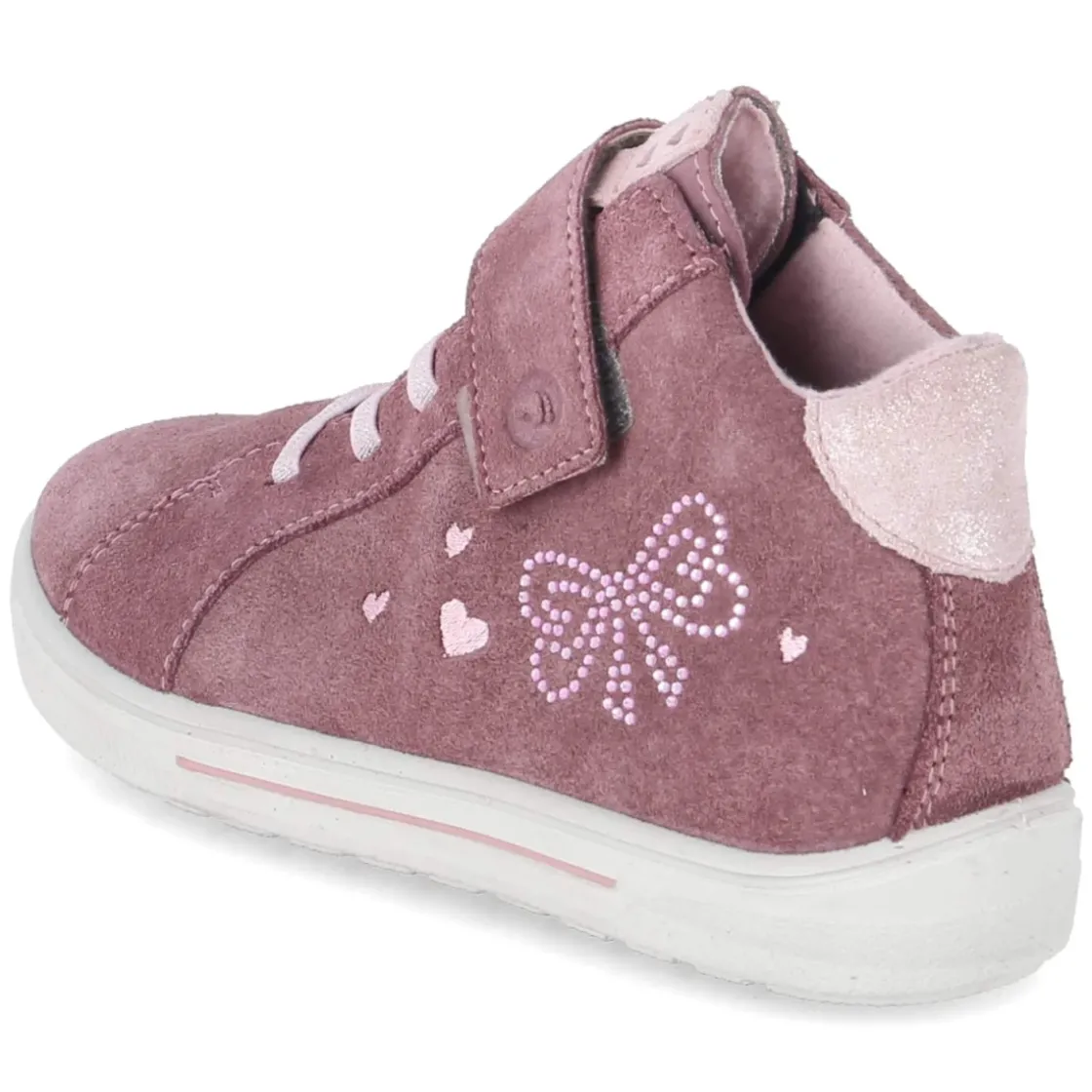 Die Stiefeletten MALA von Pepino verbinden verspieltes Design mit funktionaler Ausstattung für aktive Tage. Zartes Rosa trifft auf glitzernde Schleifenapplikation aus Strass, während robustes Rauleder und die verstärkte Ferse für Halt sorgen. Dank wasserfester, wasserabweisender Verarbeitung und atmungsaktiver Eigenschaften bleiben kleine Füße bei wechselhaftem Wetter angenehm trocken. Das leichte Futter wärmt an kühlen Tagen, die flexible Cupsohle unterstützt natürliche Bewegungen. Der bequeme Klettverschluss und das elastische Band in Schnüroptik erleichtern das An- und Ausziehen. Ein weiches Wechselfußbett und die runde Spitze steigern den Komfort im Alltag. Fällt normal aus. Modetipp: Zu warmen Strickleggings und einer wattierten Steppjacke entsteht ein harmonischer Outdoor-Look.