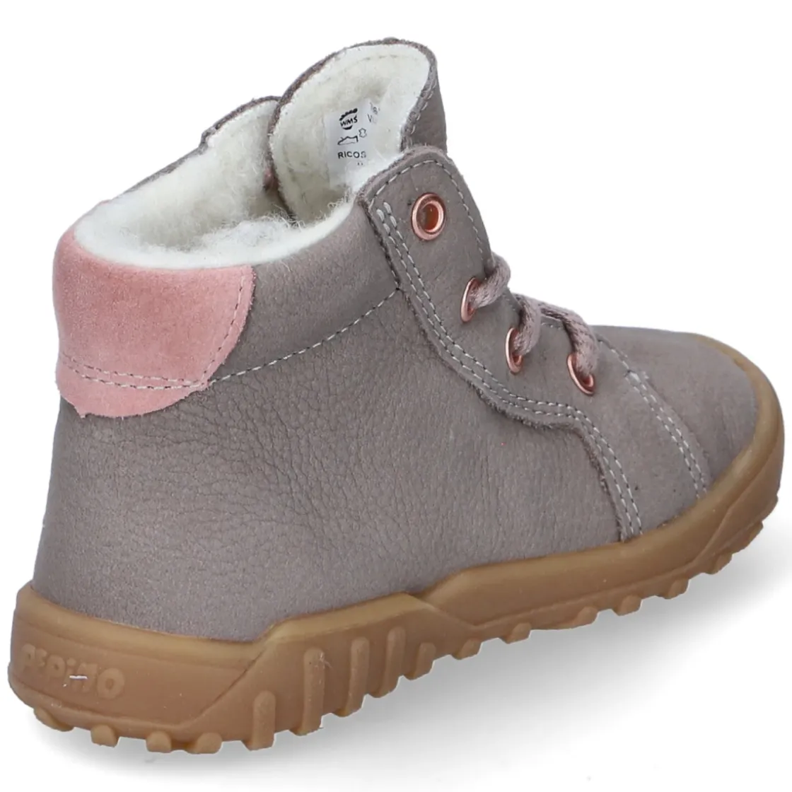 Die Winterstiefeletten DENNY von Pepino begleiten aktive Kinder zuverlässig durch kalte, nasse Tage. Weiches Rauleder in warmem Taupe trifft auf dezente, rosa Akzente, Ziernähte und feine Lochungen – robust und doch kindgerecht. Die runde Spitze bietet Zehenfreiheit, der leicht gepolsterte Einstieg und die individuell regulierbare Schnürung sorgen für einen sicheren Sitz. Dank CareTEX-Ausstattung bleiben Füße auch bei Schneematsch trocken, gleichzeitig unterstützt das atmungsaktive Material ein ausgeglichenes Klima. Innen wärmt kuschelige Lammwolle, während die textile, herausnehmbare und leicht gepolsterte Decksohle Komfort und Hygiene erleichtert. Die flexible, rutschhemmende hexa4Grip-Profilsohle gibt Halt auf winterlichen Wegen. Fällt normal aus. Modetipp: Zu Strickleggings und Cordrock oder zu Denim und Parka in Naturtönen harmoniert das Taupe besonders schön.