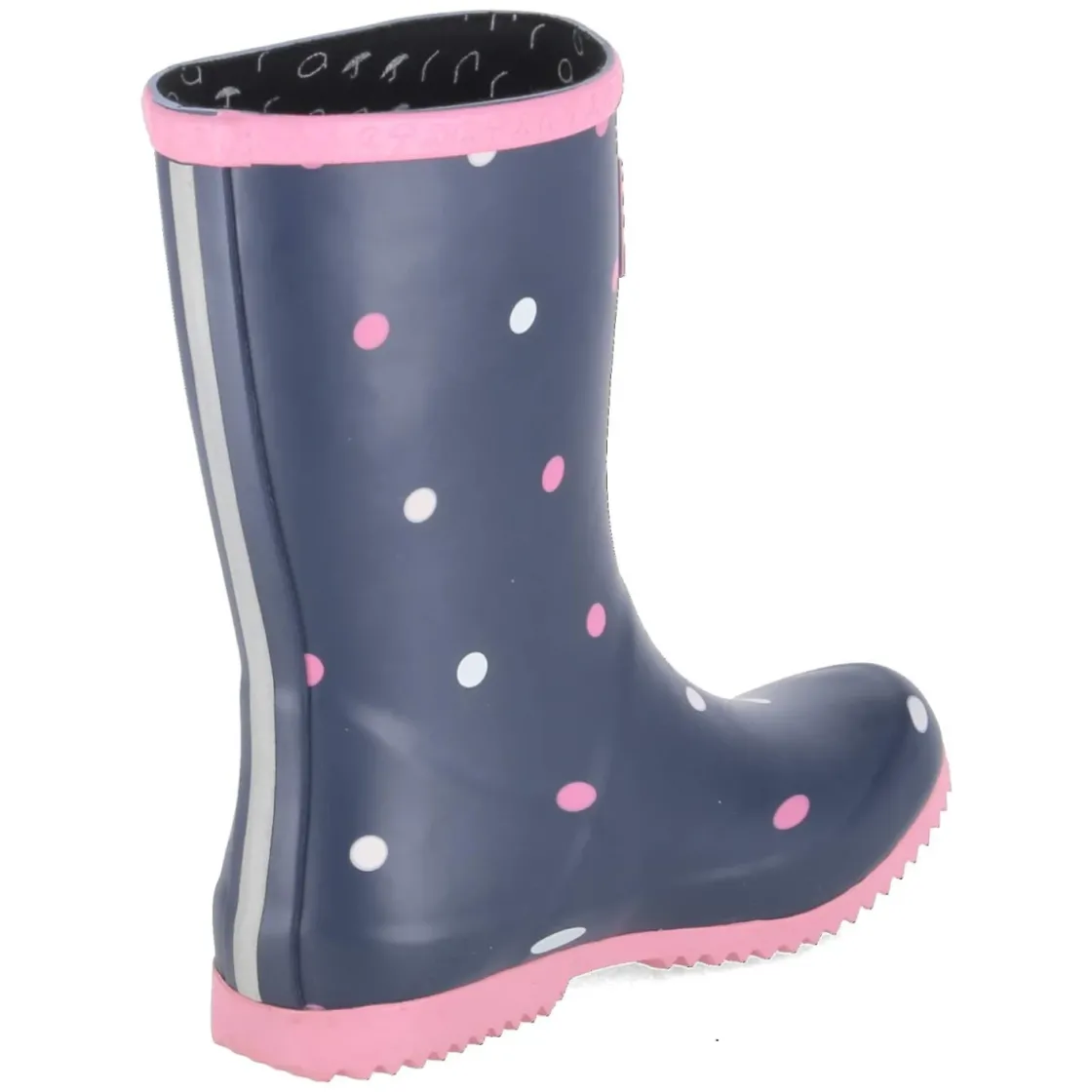 Der Rajn Gummistiefel DOTS bringt Farbe in graue Tage: Der blaue Schaft mit rosa und weißen Punkten sorgt für einen sympathischen Look, während das wasserfeste Obermaterial aus Gummi und die wasserabweisende Ausrüstung kleine Füße zuverlässig trocken halten. Die runde Schuhspitze bietet Zehenfreiheit, das dünne Textillining und die textile Decksohle tragen sich angenehm. Für zusätzlichen Komfort sorgt ein gepolstertes, herausnehmbares Wechselfußbett, das nach Abenteuern schnell gelüftet werden kann. Die flexible, rutschfeste Profilsohle gibt sicheren Halt auf nassem Untergrund. Praktisch im Alltag: ohne Verschluss für müheloses Hineinschlüpfen. Ein verstärkter hinterer Schaft mit Reflektorstreifen erhöht die Sichtbarkeit in der Dämmerung. Fällt normal aus und ist damit leicht zu wählen. Modetipp: Harmoniert besonders schön mit einem marineblauen Regenmantel und gemusterten Leggings; Stiefelsocken in Rosa setzen einen verspielten Akzent.