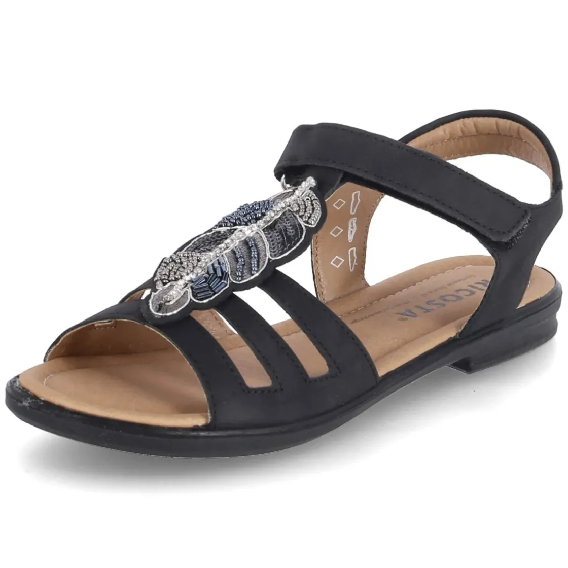 Mit den Sandalen AMELIE von Ricosta kommt ein verlässlicher Sommerbegleiter an den Fuß, der Tragekomfort und verspielte Details vereint. Das schwarze Synthetik-Obermaterial mit pflegeleichter Oberfläche lässt sich schnell säubern und passt zu sportlichen wie festlichen Outfits. Die offene Schuhspitze sorgt für angenehme Luftzirkulation, während das gepolsterte Fußbett auch bei längeren Abenteuern ein weich abgefedertes Gefühl vermittelt. Ein bequemer Klettverschluss erleichtert das An- und Ausziehen und ermöglicht eine passgenaue Justierung. Die flexible Laufsohle unterstützt ein natürliches Abrollen, ideal für aktive Tage. Ein Blickfang ist die schmückende Feder auf dem Steg, die dem Design eine leichte, fröhliche Note verleiht. Der Schnitt fällt normal aus und bietet kleinen Füßen zuverlässigen Halt. Modetipp: Zu den schwarzen Sandalen harmonieren pastellige Shorts oder ein luftiges Kleid mit zarten Prints und einem leichten Jeansjäckchen.