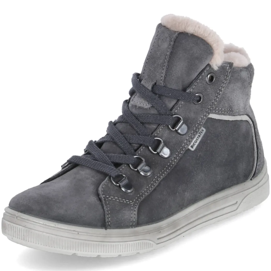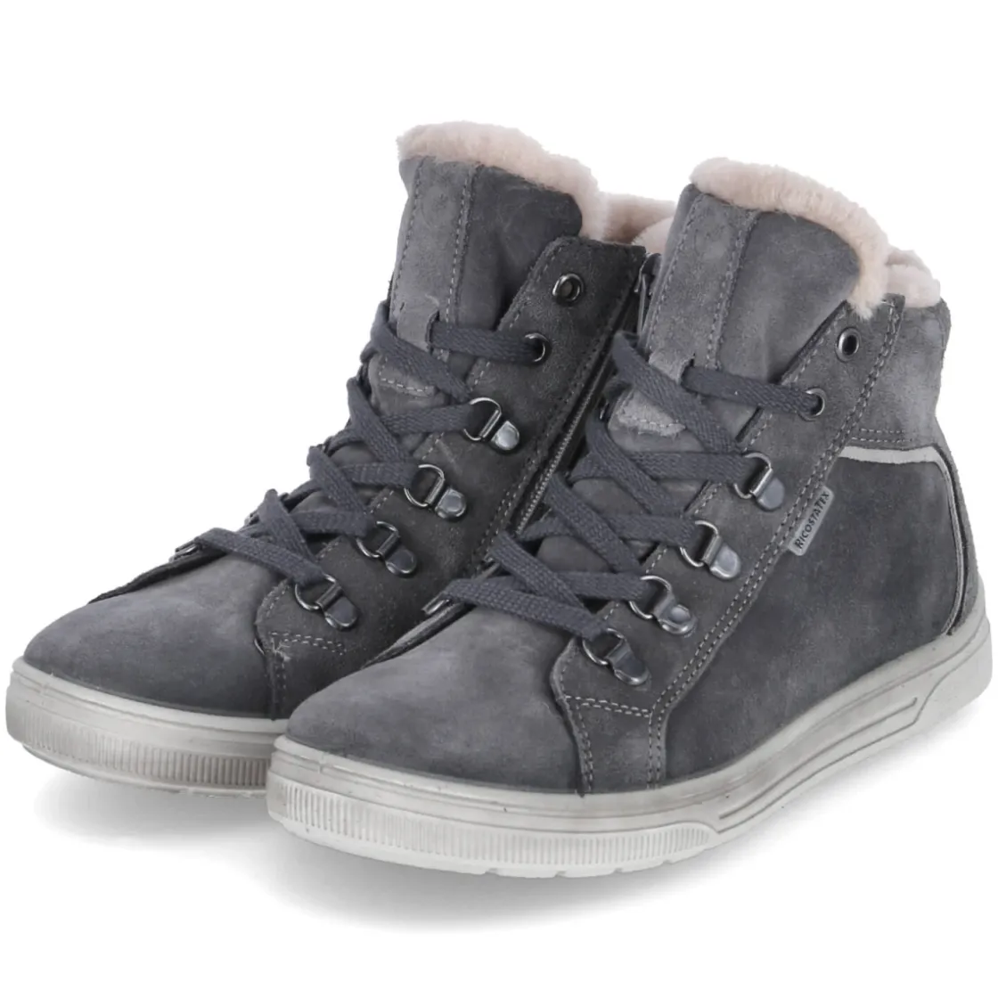 Die Stiefeletten MAREN von Ricosta vereinen zuverlässigen Wetterschutz und kindgerechten Komfort. Das weiche Warmfutter hält kleine Füße angenehm temperiert, während die Kombination aus wasserfesten und atmungsaktiven Eigenschaften das Klima im Schuh ausbalanciert. Das Obermaterial aus Rauleder zeigt sich in edlem Grau und lässt sich dank der guten Kombinationsmöglichkeiten mühelos in Alltagslooks integrieren. Für individuelles Anpassen sorgt die Schnürung, der zusätzliche Reißverschluss ermöglicht ein schnelles An- und Ausziehen. Die runde Schuhspitze bietet Zehenfreiheit, die Textil-Decksohle liegt angenehm auf der Haut. Praktisch: Das Wechselfußbett lässt sich zum Lüften oder für eigene Einlagen herausnehmen. Der Schnitt fällt normal aus. Modetipp: Mit Thermoleggings, Steppjacke und Stricksocken in Kontrastfarbe entsteht ein lässiger Winterlook.
