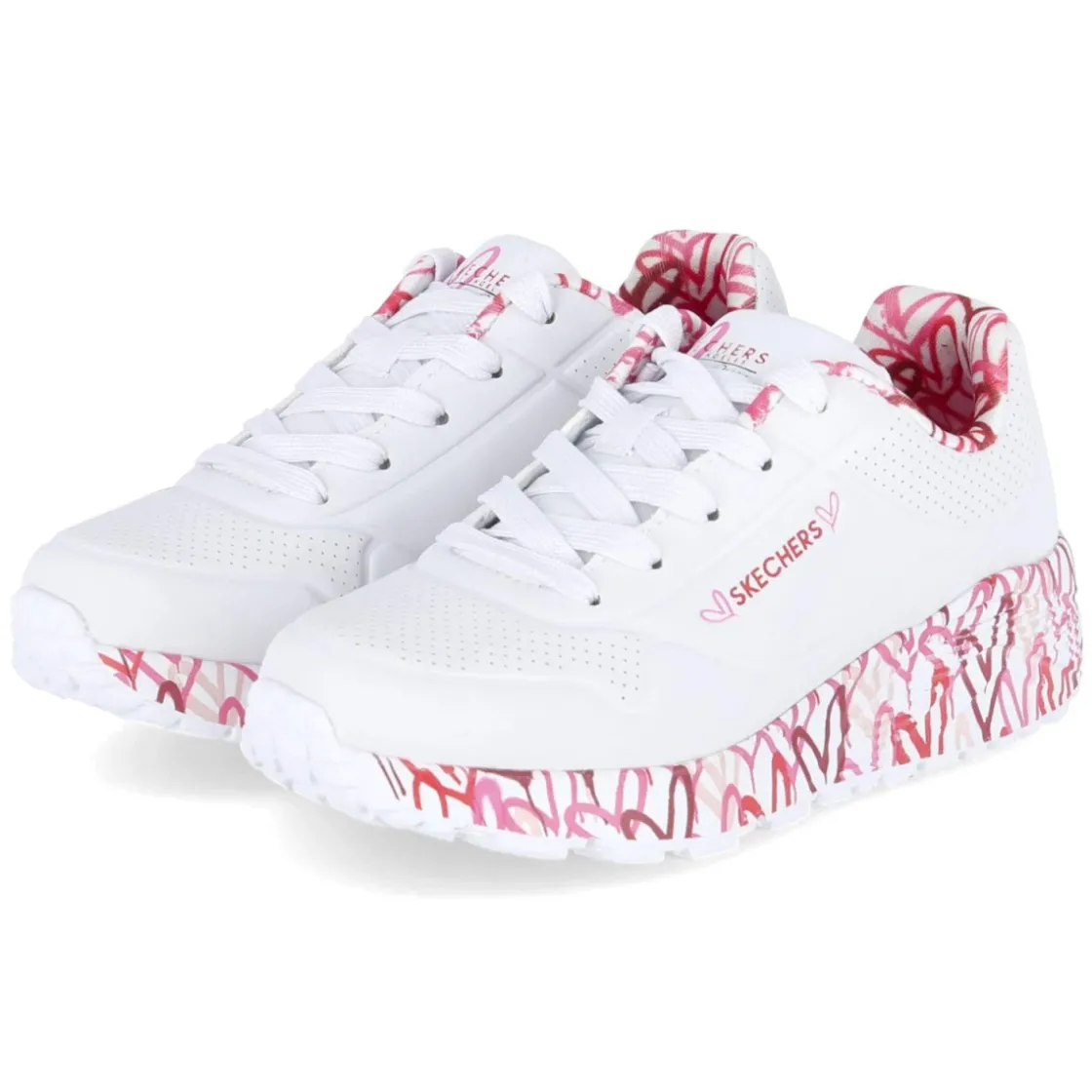 Der Low Sneaker LOVELY LUV von Skechers verbindet spielerischen Look mit hohem Tragekomfort. Das weiße Synthetik-Obermaterial zeigt sich pflegeleicht und bleibt dank feiner Lochungen am Schuhdeck angenehm luftig. Die runde Spitze und die gepolsterte Einstiegszone geben viel Bewegungsfreiheit, während die Schnürung sicheren Halt bietet. Das Air-Cooled Memory Foam Fußbett passt sich weich an und entlastet Kinderfüße auch an langen Tagen. Die textile Decksohle unterstützt das angenehme Klima im Schuh. Eine weiße, flexible, rutschhemmende Laufsohle sorgt für Grip auf wechselnden Untergründen, das relaxt leichte Design für unbeschwertes Tragen. Ein verspielter, rosa Herzprint am Sohlenrahmen und Einstieg setzt einen frischen Akzent. Fällt größengetreu aus. Modetipp: zu Pastell-Jogger und Ringelshirt oder zu Denim-Shorts mit bunten Söckchen.