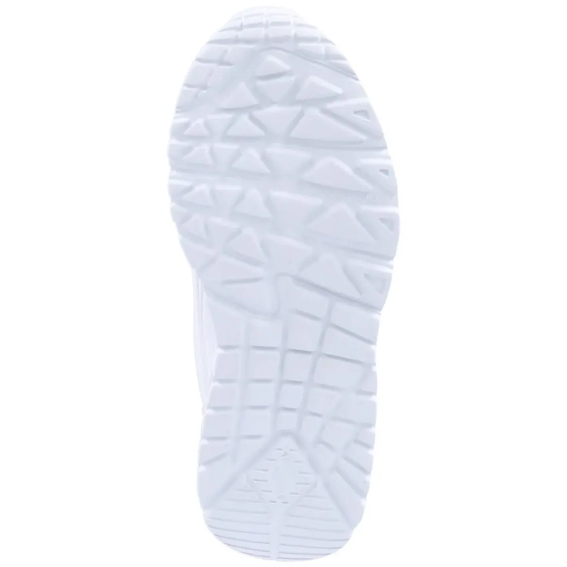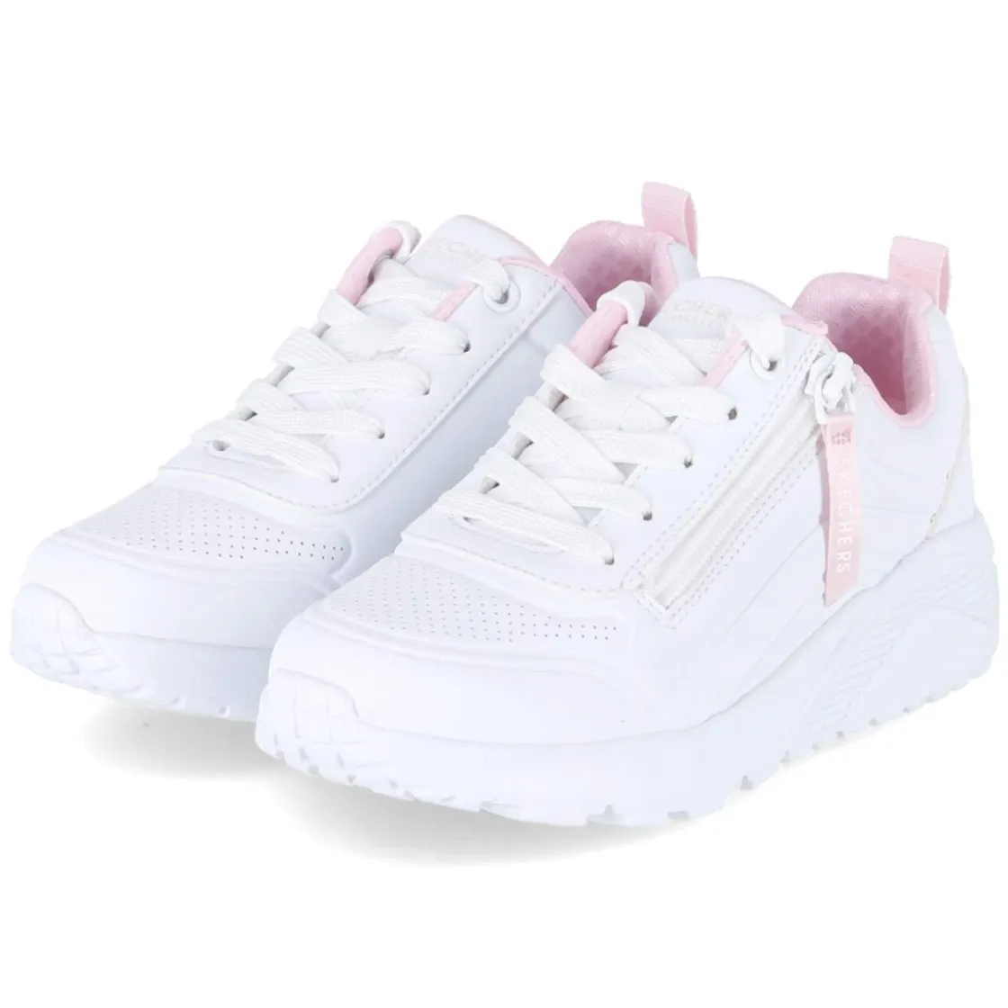 Der Sneaker UNO LITE – EASY ZIP von Skechers verbindet kindgerechten Komfort mit sportlicher Optik. Das weiße Synthetik-Obermaterial zeigt sich modern mit rosa Akzenten, teils perforierten Partien und dynamischen Prägungen. Dank Kombi aus Schnürsenkeln und seitlichem Reißverschluss gelingt das An- und Ausziehen im Alltag im Handumdrehen, die runde Schuhspitze sowie verstärkte Zehen- und Fersenbereiche sorgen für zusätzliche Robustheit. Ein weich gepolsterter Einstieg und die textile, gepolsterte Decksohle bieten angenehme Dämpfung, während die flexible, rutschhemmende Laufsohle sicheren Halt auf dem Schulhof und beim Spielen liefert. Praktisch im Alltag: der Schuh ist waschmaschinengeeignet und fällt größengetreu aus. Modetipp: Besonders stimmig zu hellen Jeans, sportiven Jogpants oder Shorts und einem Hoodie mit rosa Details; weiße Socken runden den frischen Look ab.